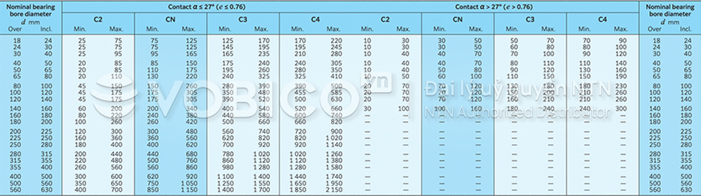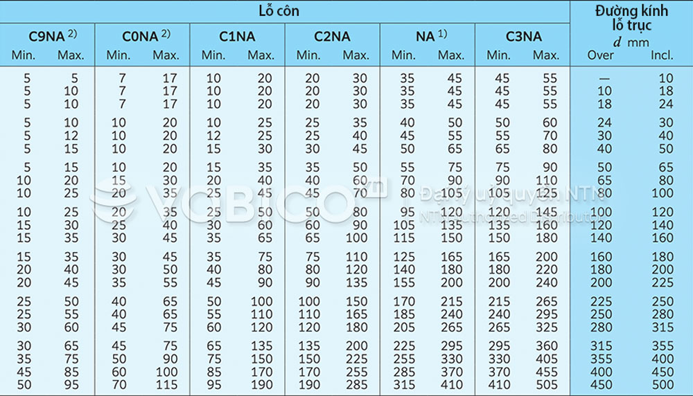 2) Khe hở C9NA, C0NA và C1NA chỉ áp dụng cho các vòng bi chính xác thuộc tiêu chuẩn JIS cấp 5 trở lên.
